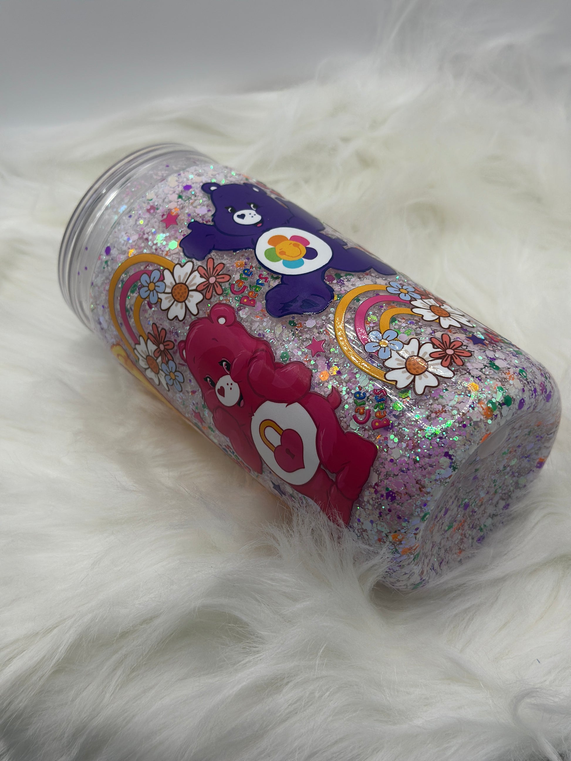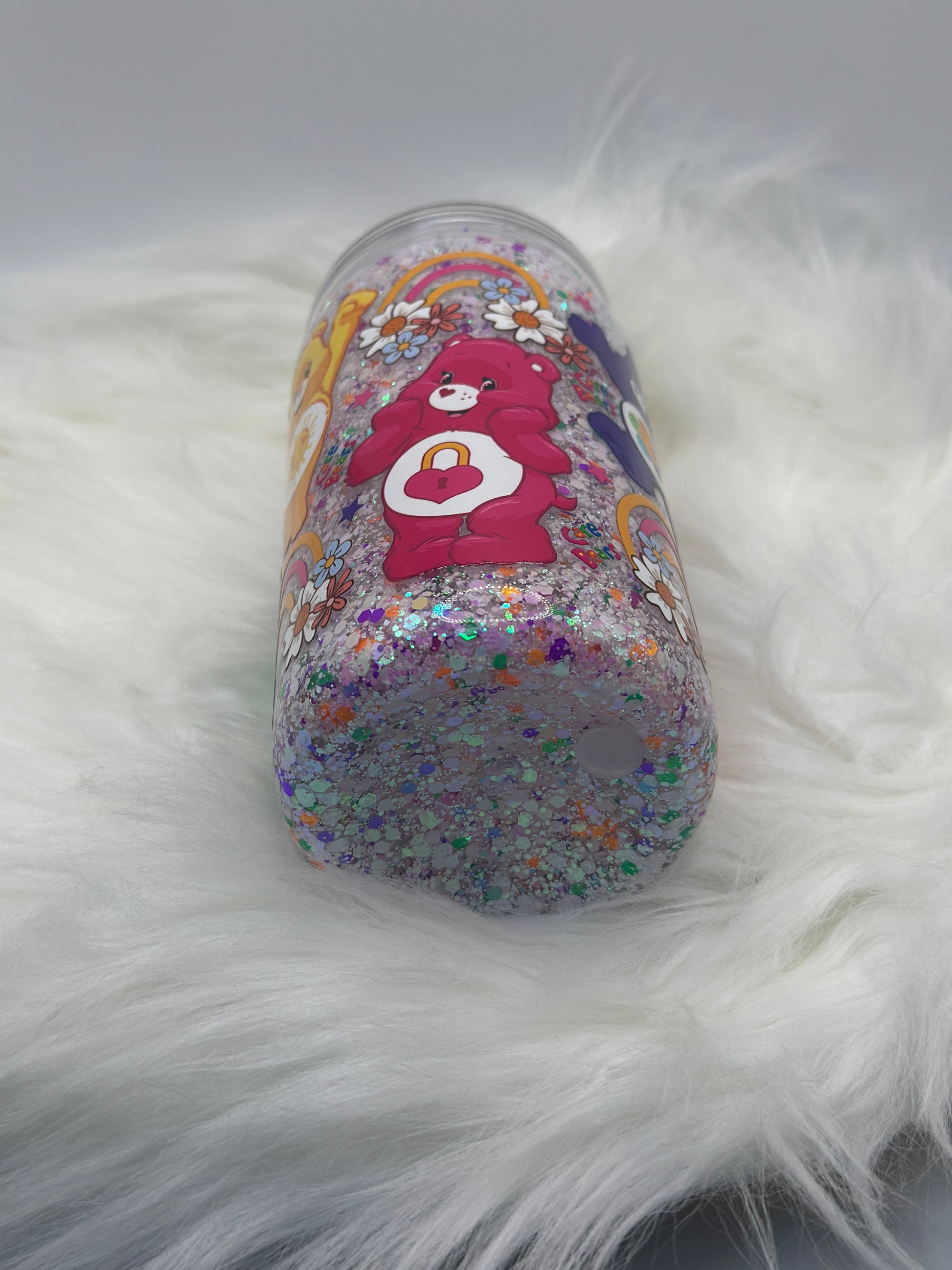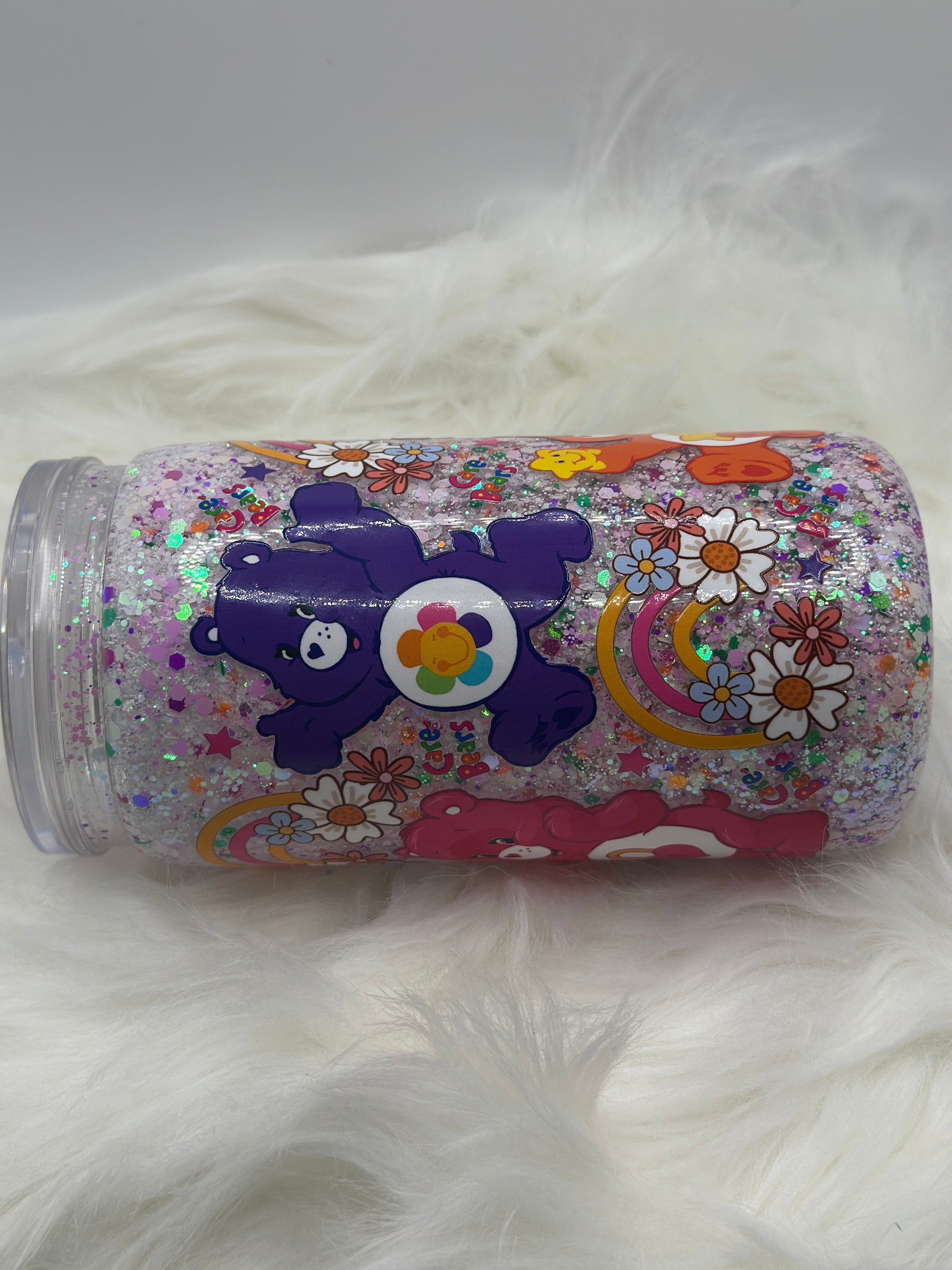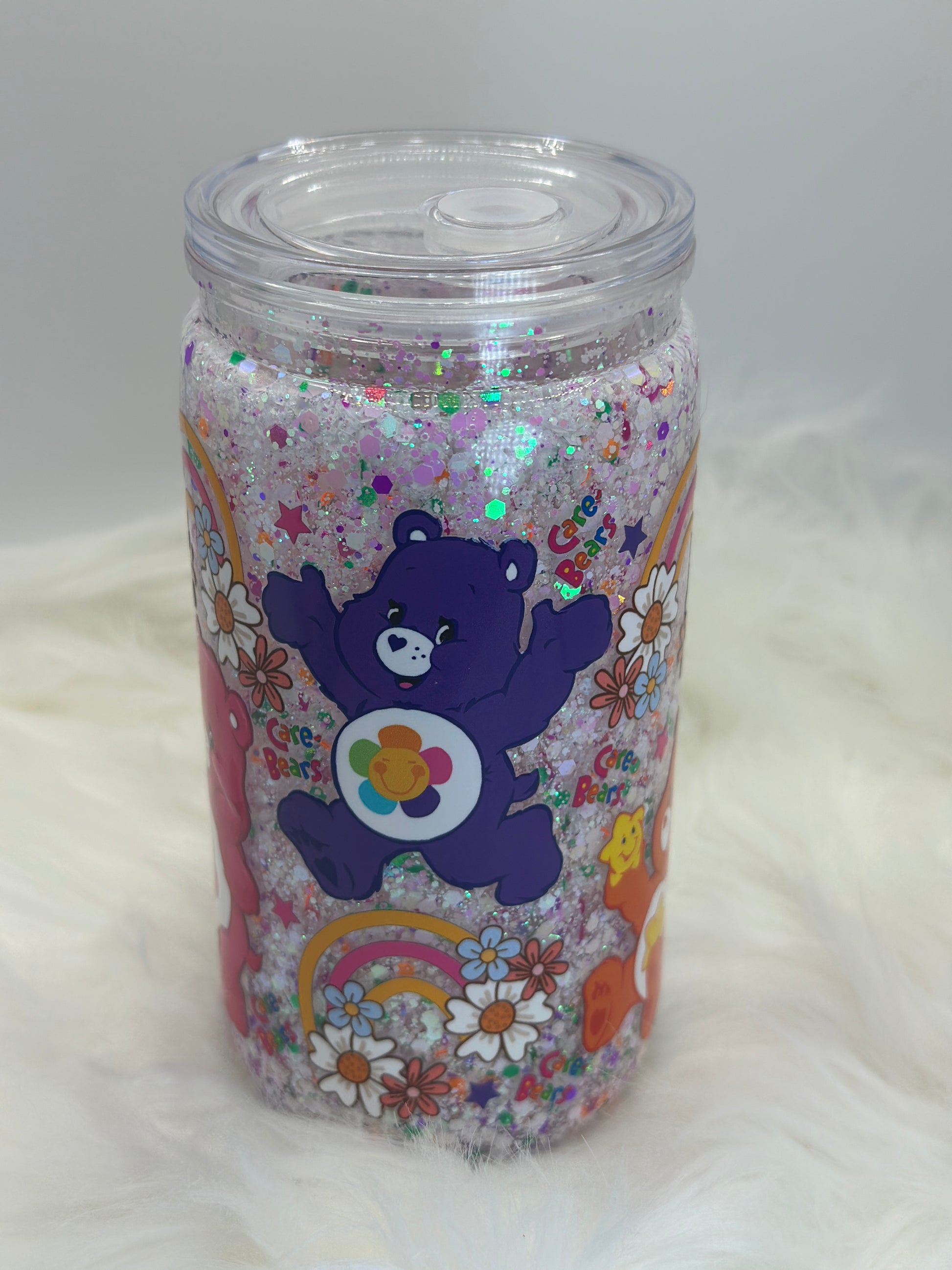 “Adorable 16oz acrylic Care Bears snowglobe tumbler, filled with sparkling glitter and playful rainbow designs—perfect for adding a touch of nostalgia and magic to your drinks!”